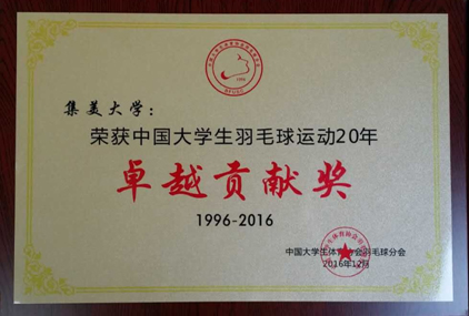 近日,中国大学生体育协会羽毛球分会成立20周年庆典大会在北京交通大学举行。大会回顾了羽毛球分会成立二十年来的发展历程,并对长期致力于大学生羽毛球运动发展、对大学生体育事业作出杰出贡献的单位和个人进行了表彰。我校被授予中国大学生羽毛球运动20年“卓越贡献奖”;校原工会主席李金水、体育学院羽毛球教练杨强益获“功勋荣誉奖”。