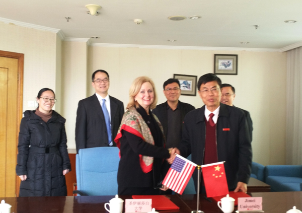 1月16日上午,校长苏文金会见了美国新泽西州圣伊丽莎白大学校长海伦•史翠柏、美国圣伊丽莎白大学中国总校区校长助理黃磊康博士一行,两校正式签署了合作意向书。
