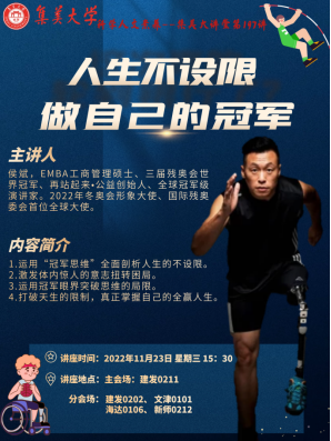 简介:EMBA工商管理硕士、三届残奥会世界冠军、再站起来·公益创始人、全球冠军级演讲家。2022年冬奥会形象大使、国际残奥委会首位全球大使。